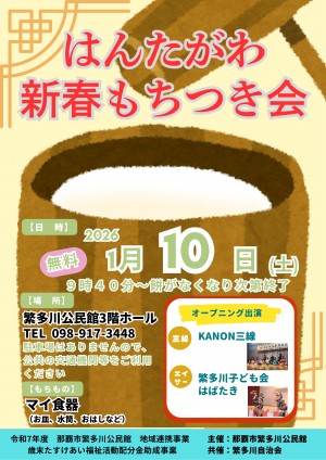 ☆新春もちつき会☆年始初めのイベントとして、新春もちつき会を下記の日程で行います。もちつきの体験やふるまいのほかにも、三線演奏、エイサー演舞、本の読み聞かせもありますよ。マイ箸・マイ食器をご持参のう...